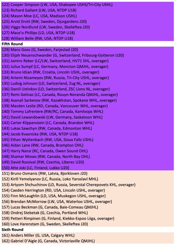 My sixth tier is led off by the lone re-entry within my Top 224, that being WHL defender Carter Sotheran — a 6-foot-4 rightie who was on Canada’s radar for the World Juniors at last year’s Summer Showcase but struggled throughout this season with a glaring minus rating for months before recovering and coming on strong again during Portland’s playoff run. He has some health concerns that may have resulted in Philadelphia relinquishing his rights, but I’m still a fan of Sotheran — as evidenced by ranking him higher as a re-entry (116) than his original draft position (135) in 2023, albeit in that same tier of mid-round considerations.