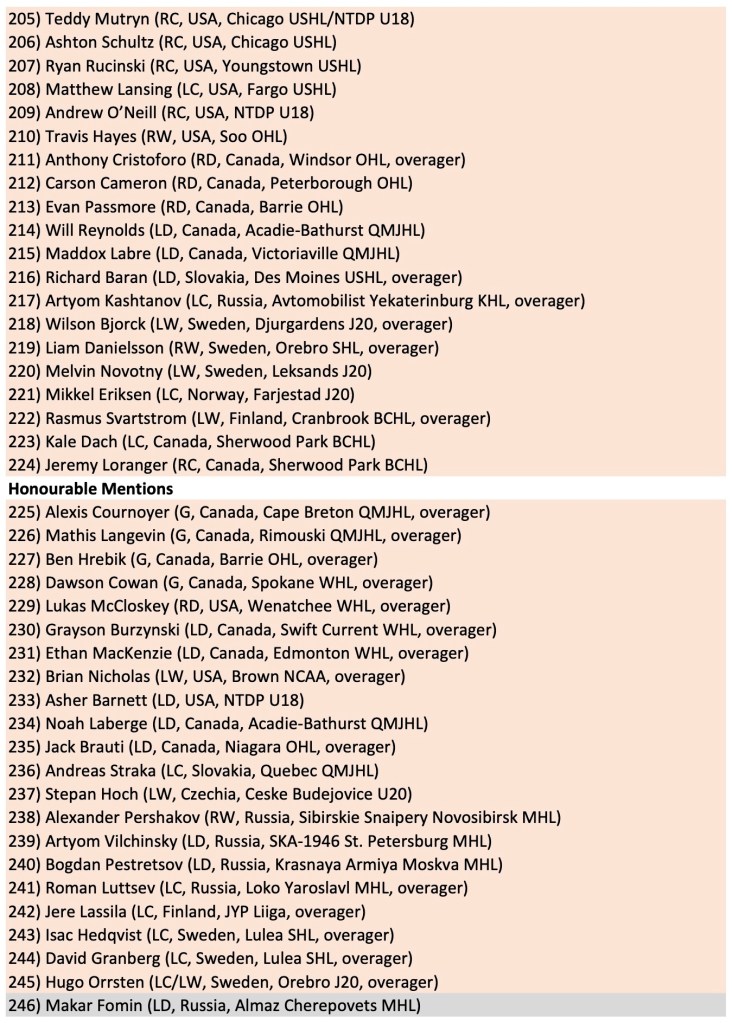 That allowed me to really broaden my horizons in recent months after my local club, the Kelowna Rockets, missed the playoffs. Playing catch-up on the rest of this 2025 class wasn’t easy and I’d be lying if I said I could provide detailed reports on all 325 prospects from my final rankings. Perhaps for the Top 100 or my first five tiers but, beyond that, it is simply research and networking to round out my list.