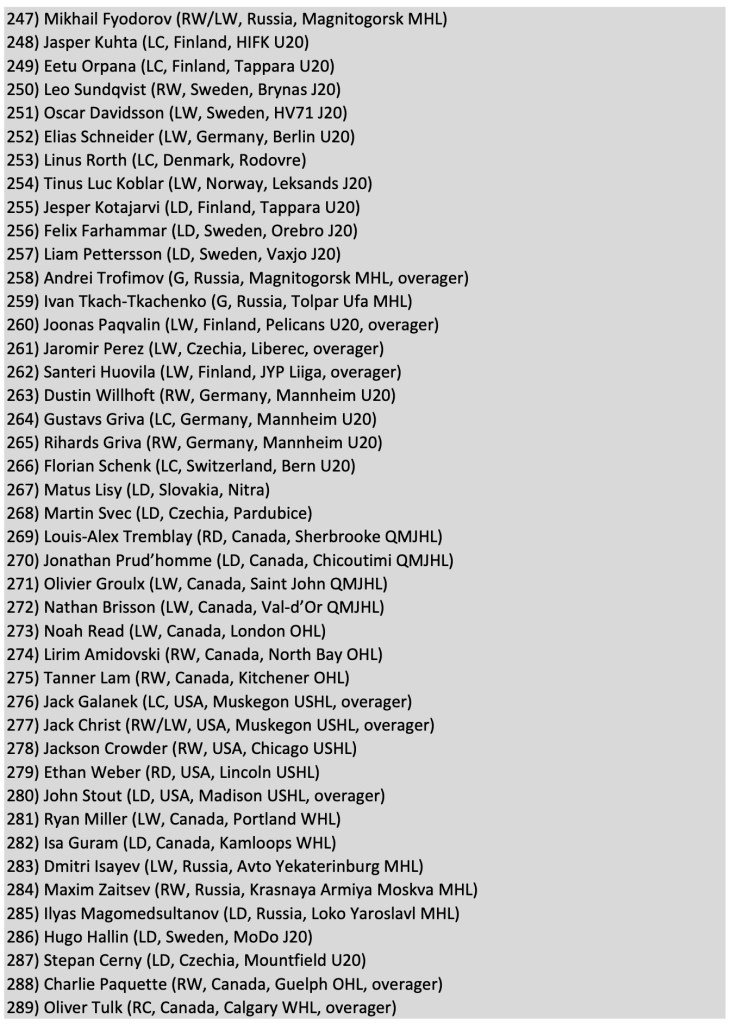 The positional breakdowns are always interesting, with right-handed centres at a premium again, along with the perennially coveted right-shot defenders. This class of goaltenders gradually grew on me and now I’m seeing value in those middle rounds. I really like my Top 10 at that position, even vouching for my Top 16, but I’m sure there will be closer to 30 goaltenders taken, including some obscure netminders that I’ve never heard of and a number of overagers, considering there are 32 teams drafting.