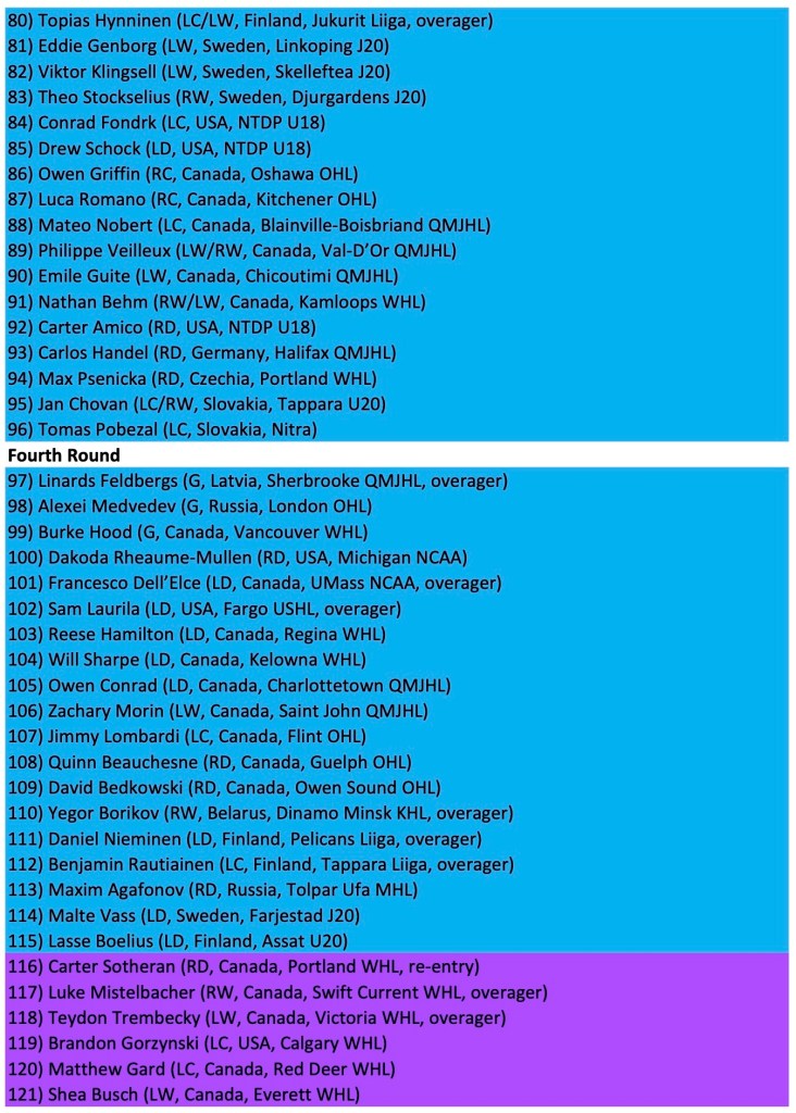 Another category that always captivates me is the overagers, including re-entries. Every year between 30 and 50 previously passed over or unsigned prospects are selected on their second, third or (for Europeans) even fourth time through the draft. So the eligible birth dates range from Jan. 1, 2004 (Jan. 1, 2005 for North Americans) to Sept. 15, 2007.